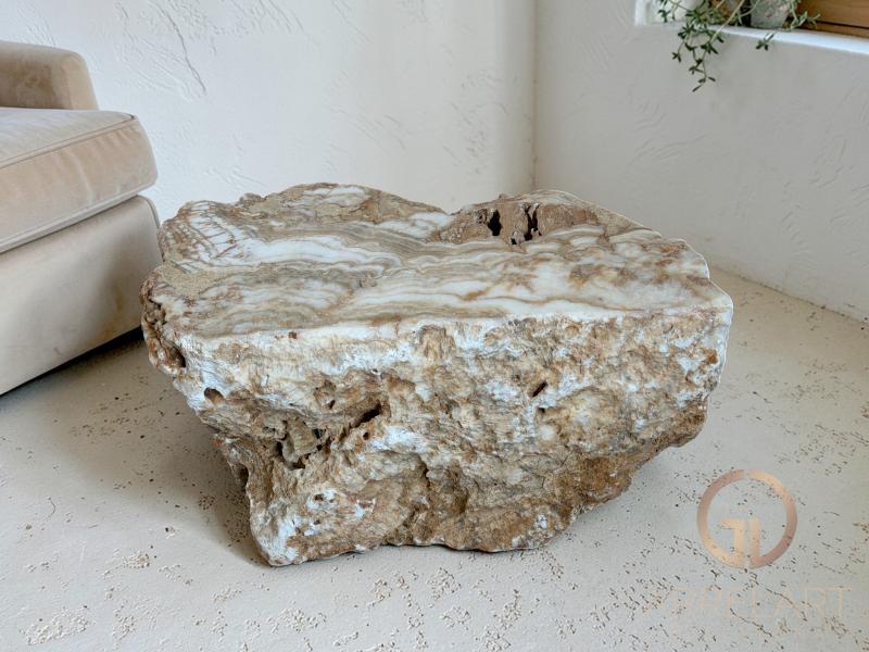 La mesa está fabricada con piedra de ónix natural, un material formado por procesos geológicos de sedimentación que generan vetas únicas y translúcidas. Su parte superior se presenta pulida para facilitar el uso diario, mientras que los laterales mantienen la estructura mineral original.