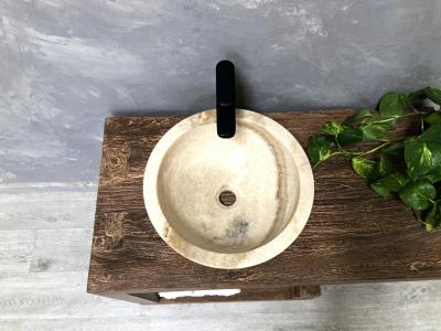 Round washbasin in natural polished onyx stone in ocher, beige and earth colors.