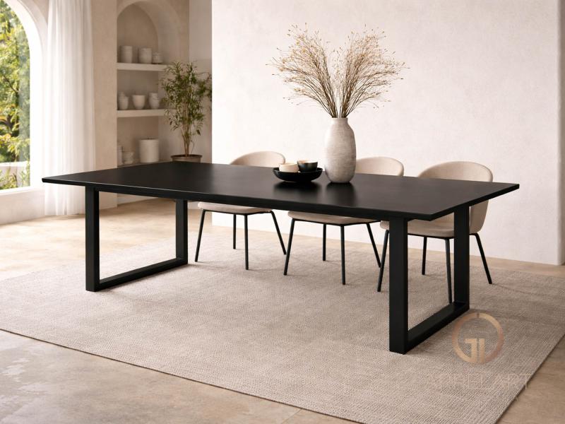 Mesa de comedor en madera maciza de suar, definida por su sobriedad y presencia. El acabado en negro satinado unifica la superficie y suaviza la veta, aportando profundidad y una estética más contemporánea. Los pies en metal negro refuerzan sus líneas limpias.