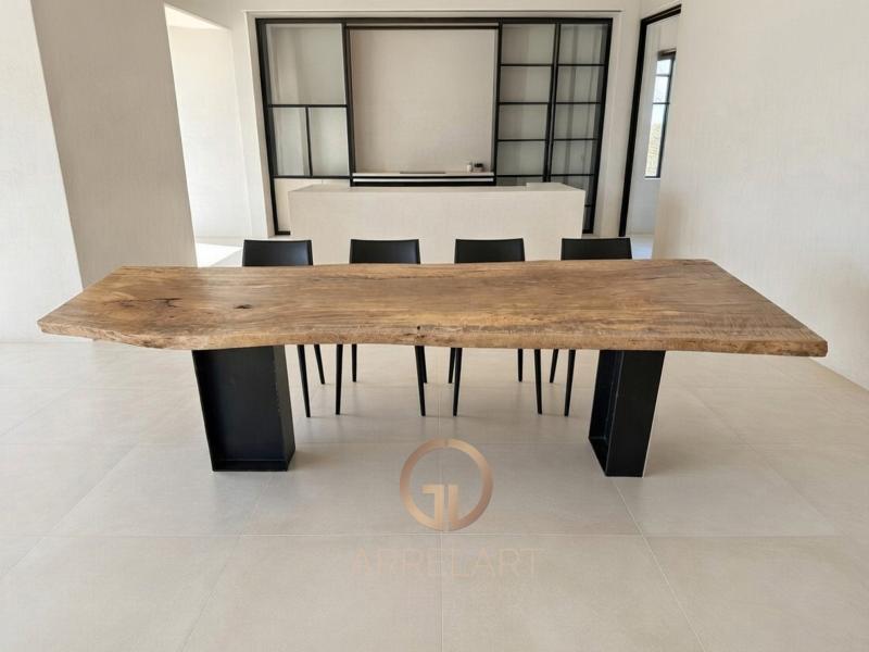Mesa de comedor tallada en una sola pieza en madera maciza de mango. Su superficie orgánica mantiene las formas naturales del material, aportando textura y calidez. Se apoya sobre dos sólidas vigas de hierro negras, aportando estabilidad y un carácter contemporáneo sin perder sutileza.