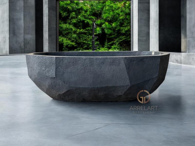 Cette baignoire est fabriquée en terrazzo, un mélange de ciment, d'agrégats de pierre naturelle et d'autres matériaux qui offrent une grande résistance et une grande durabilité. Un pigment noir a été soigneusement intégré au mélange, créant une finition uniforme et profonde. L'extérieur a été fabriqué à la main par des maîtres artisans, ce qui donne une texture unique qui imite la pierre naturelle et une finition esthétique exclusive.