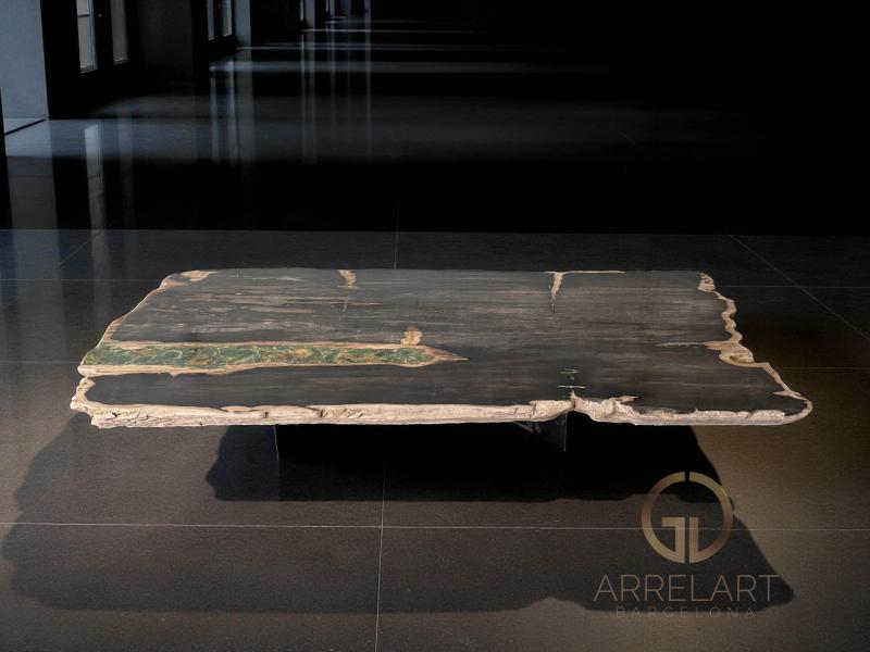 Table en bois pétrifié de 2 m de large, une pièce unique qui allie force et élégance naturelle. La surface polie révèle les tons sombres et beiges de la pierre, tandis que les bords conservent la texture originale du tronc. Sur l'un des côtés, des pierres précieuses aux tons verts s'intègrent de manière organique, créant un contraste fascinant et apportant une touche artistique et exclusive à cette table exceptionnelle.