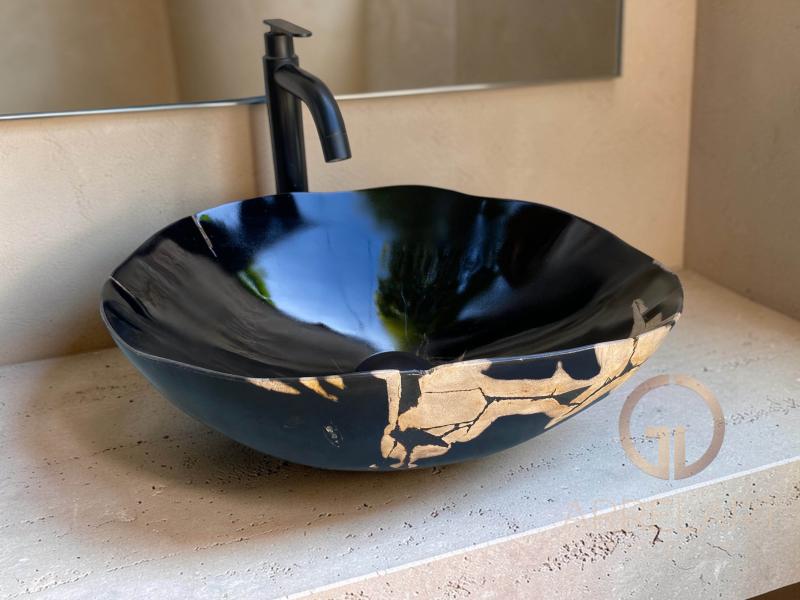 Vasque à Poser en bois pétrifié, travaillé de manière artisanale pour obtenir une finition fine et élégante. La pièce a subi un processus méticuleux de moulage et de polissage à la main, qui met en valeur la douceur de ses formes et la beauté de son grain. Les tons noirs et beiges, entièrement naturels, reflètent le passage du temps et la transformation du bois en pierre au cours de millions d'années.