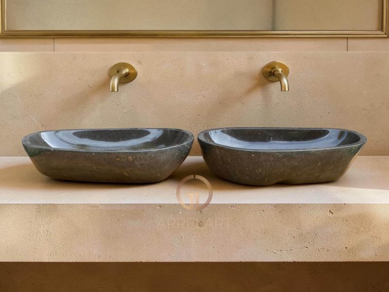 Paire de lavabos en pierre naturelle de rivière, taillés dans un seul bloc, comme en témoignent la continuité de leurs teintes et de leurs veines. Leur forme organique et équilibrée apporte une harmonie visuelle.