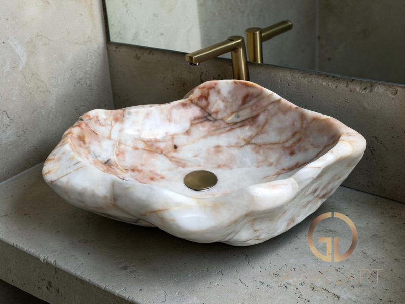 Ce vasque est fabriqué en pierre naturelle d'onyx, avec une forme organique qui respecte les douces courbes de la nature.