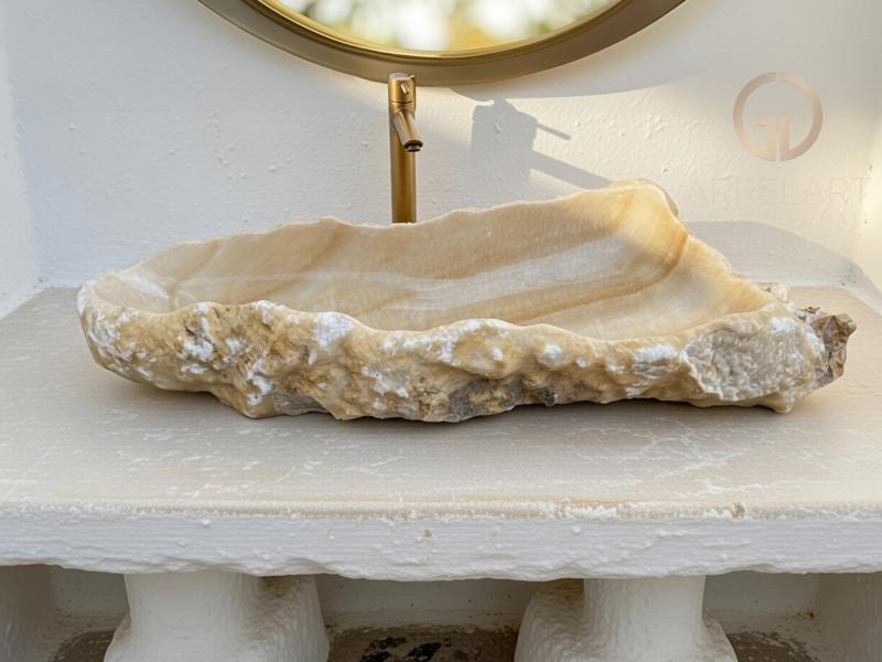Questo lavabo in pietra naturale di onice è un pezzo unico che trasforma il bagno in uno spazio esclusivo. Le sue delicate tonalità crema, avorio e venature dorate conferiscono luce ed eleganza naturale. L'interno è stato lucidato a mano dal nostro maestro artigiano, ottenendo una finitura brillante che esalta la profondità e la trasparenza dell'onice, mentre l'esterno conserva la sua texture originale, rispettando la forma e la bellezza autentica della pietra.