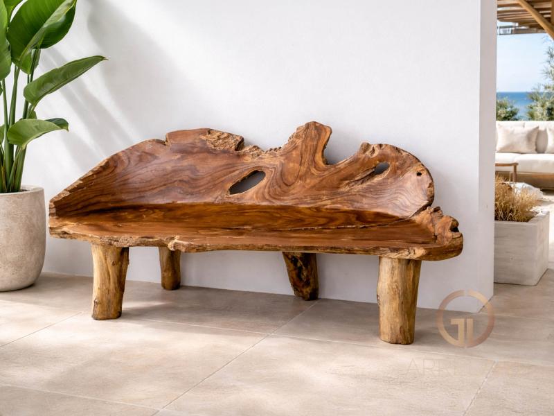 Panca rustica realizzata in legno massello di teak, un pezzo unico che si distingue per le sue forme organiche e le venature naturali irripetibili. Il suo design scultoreo, ricavato da un unico tronco, conferisce carattere e autenticità a qualsiasi ambiente. La finitura con vernice trasparente satinata protegge il legno ed esalta la sua texture, mantenendone l'aspetto naturale.