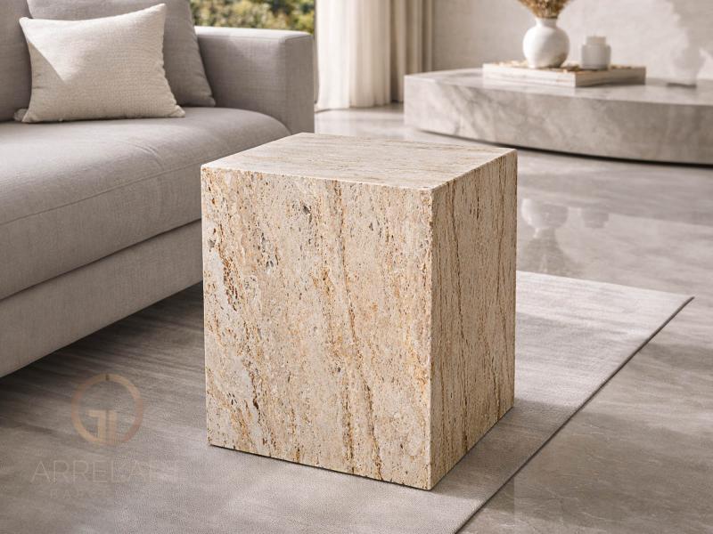 Questo sgabello quadrato è ricavato da un unico pezzo di marmo massiccio, con linee rette che ne esaltano la forma sobria e senza tempo. La sua superficie mostra i toni naturali della pietra, conferendo un'eleganza serena e autentica.