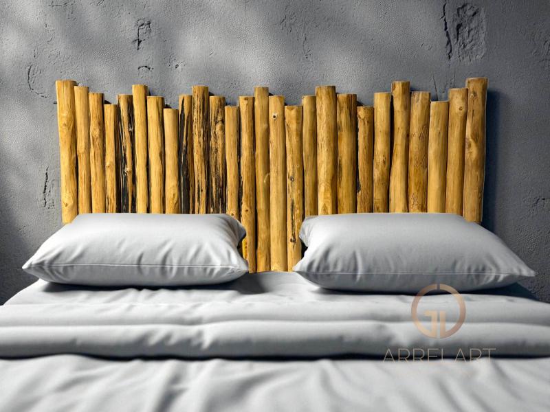 Spettacolare testiera realizzata con cilindri in legno massello di teak. Realizzati artigianalmente insieme e in diverse dimensioni per dare un effetto selvaggio ed esotico alla tua decorazione.